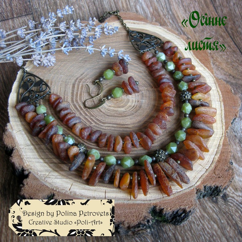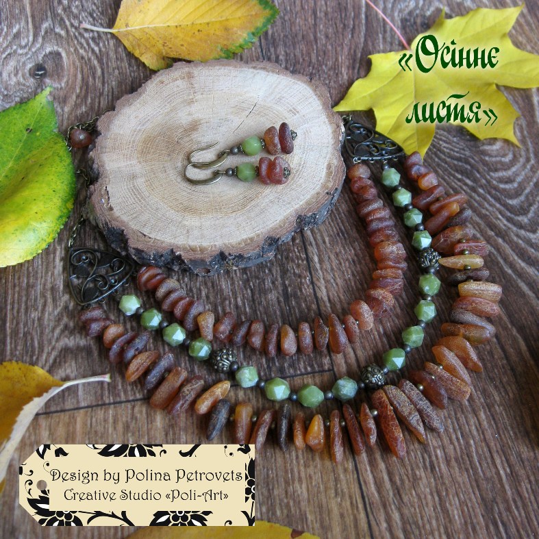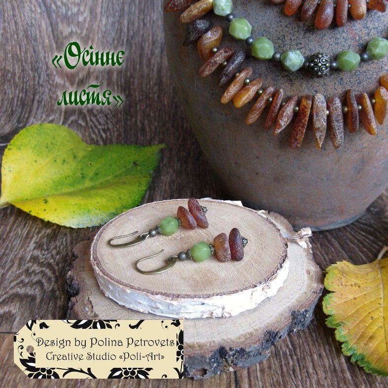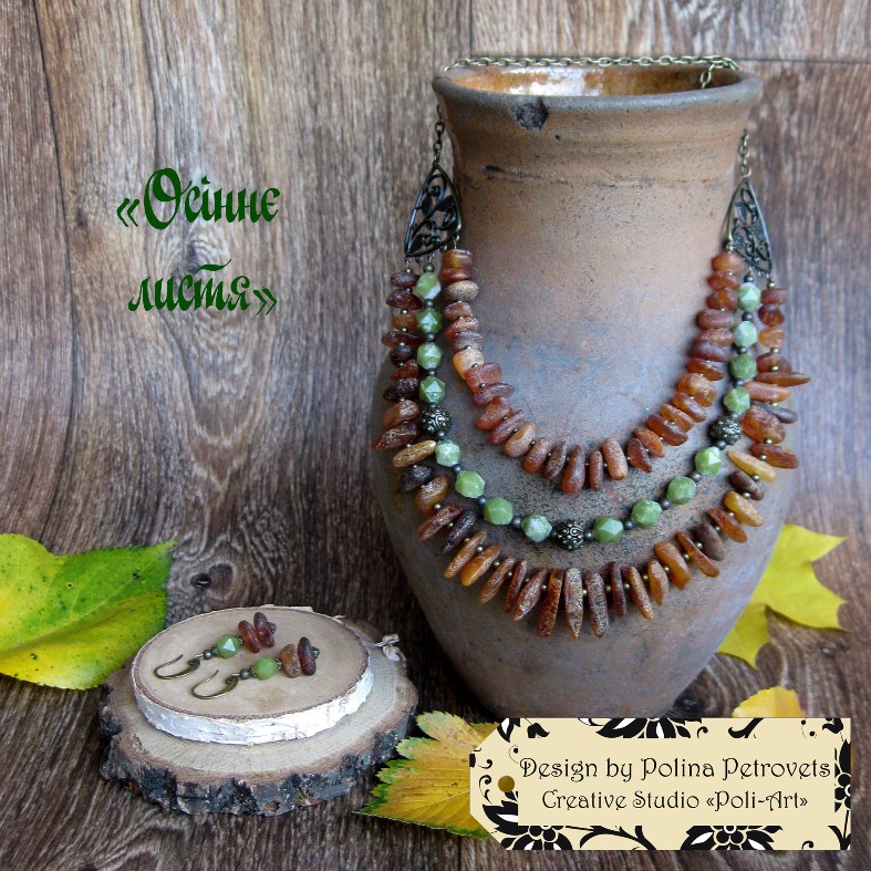Introduction » За видами подарунків / виробів » Авторські прикраси » Намиста » Намисто і сережки з бурштину та граненого нефриту "Осіннє листя"