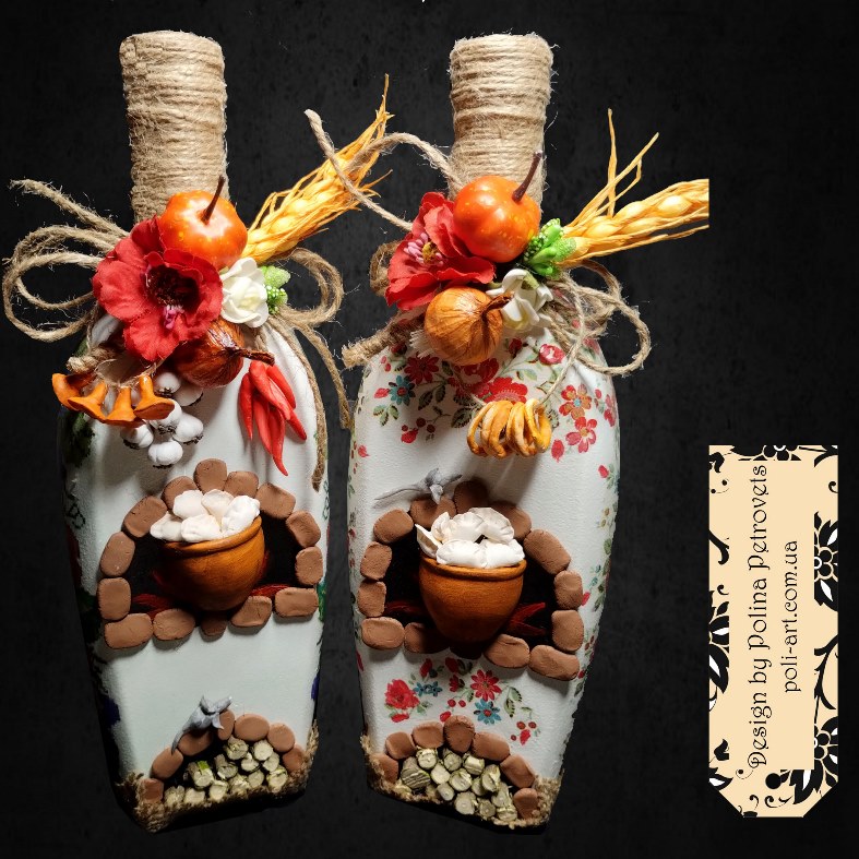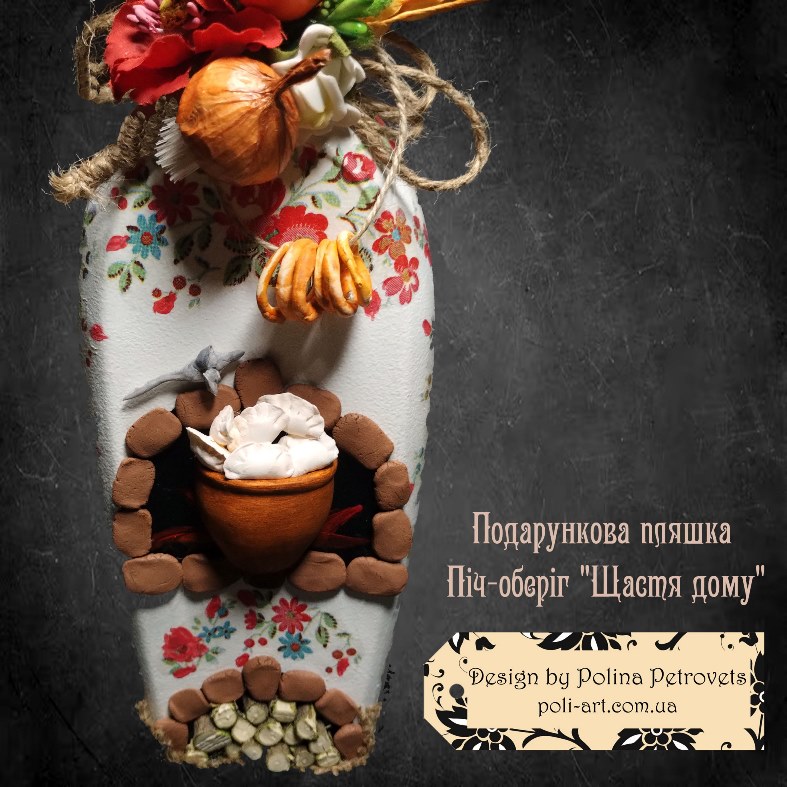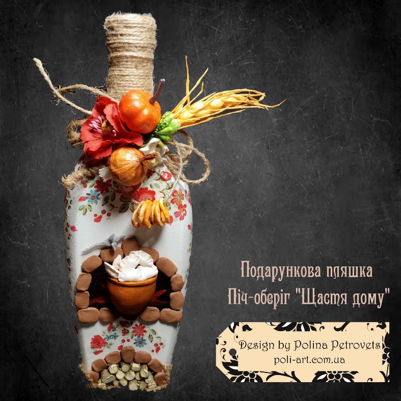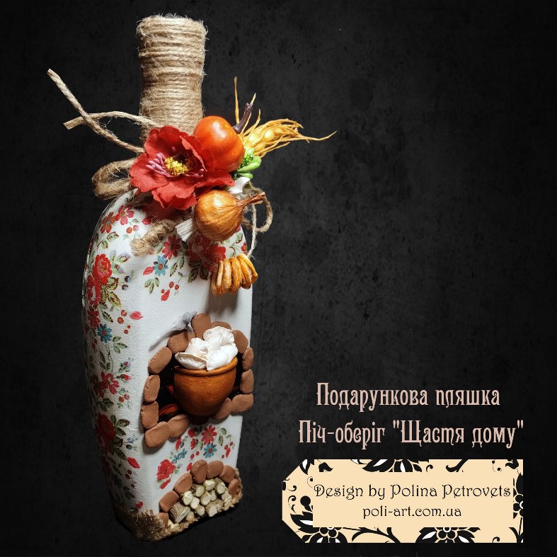Introduction » За видами подарунків / виробів » Декор алкоголю » Подарункова пляшка (робота з декорування) Піч-оберіг "Щастя Дому"