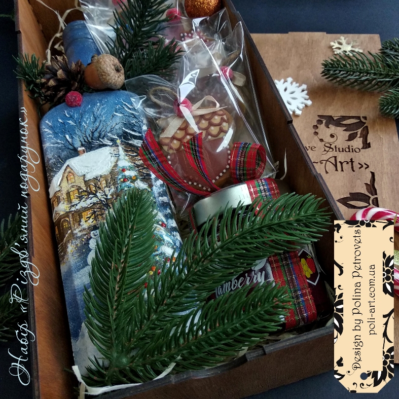 Набір включає в себе декоровану пляшку горілки, кілька новорічних / святкових пряників та невеличка баночка смачного варення, що пакується у брендовану фанерну скриньку.