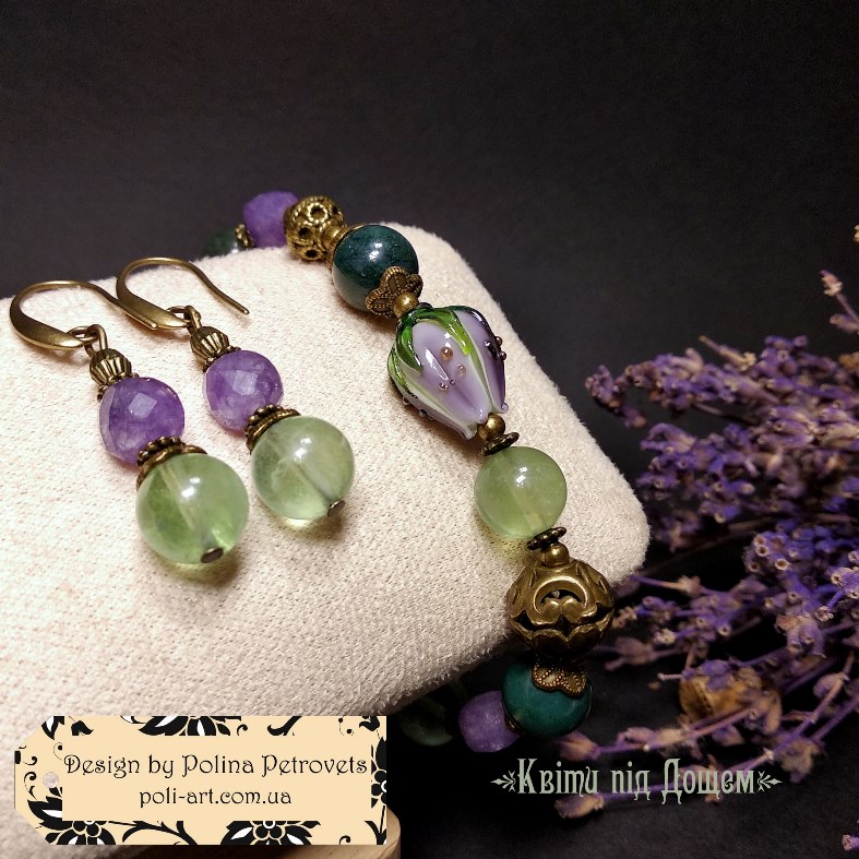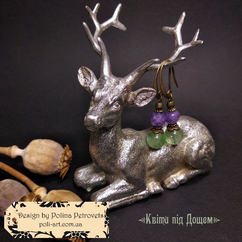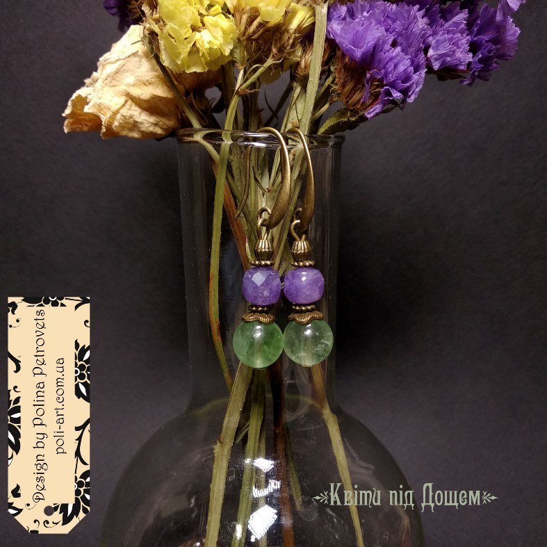 Introduction » За видами подарунків / виробів » Авторські прикраси » Сережки з флюоритом і аметистом "Квіти під Дощем"