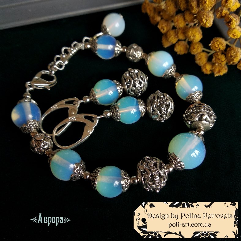 Матеріали: намистини натурального Місячного каміння (Кристал - сапфірове скло), металева фурнітура та металеві намистини срібного кольору - біжутерний сплав, швензи - сплав медичного призначення.