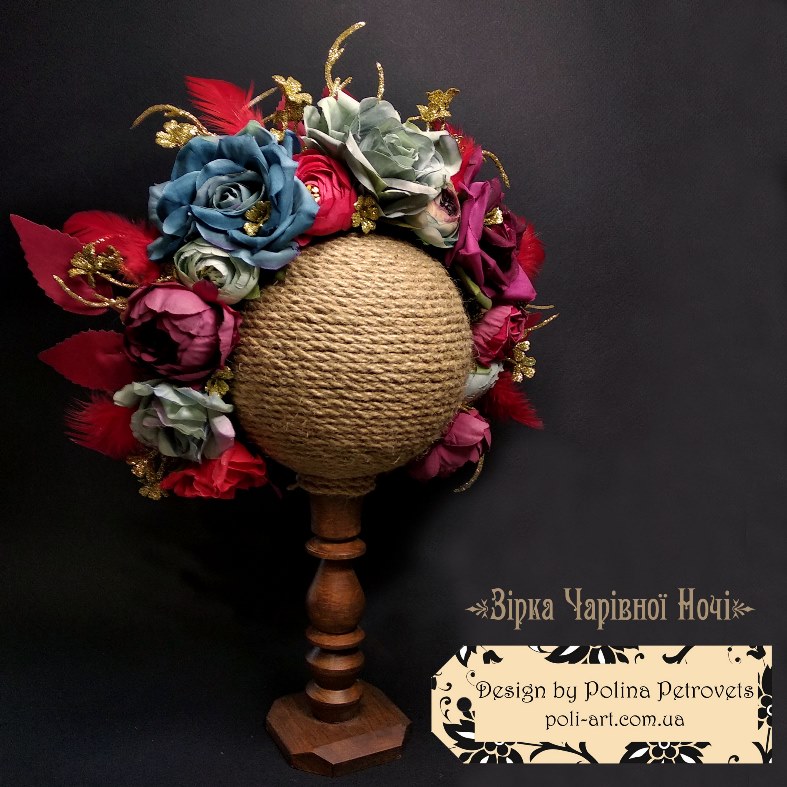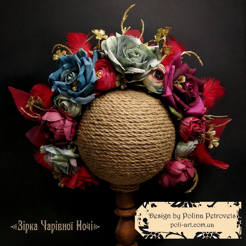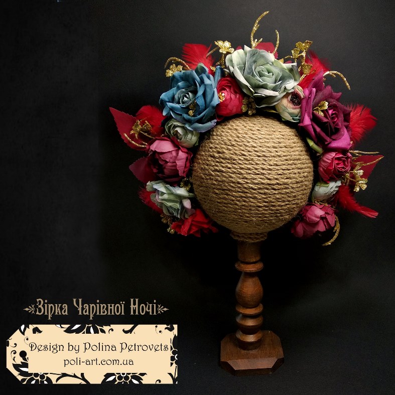 Матеріали: тканина - велюр, квіти штучні з тканини, декоративні елементи. Основа - зручний обруч.